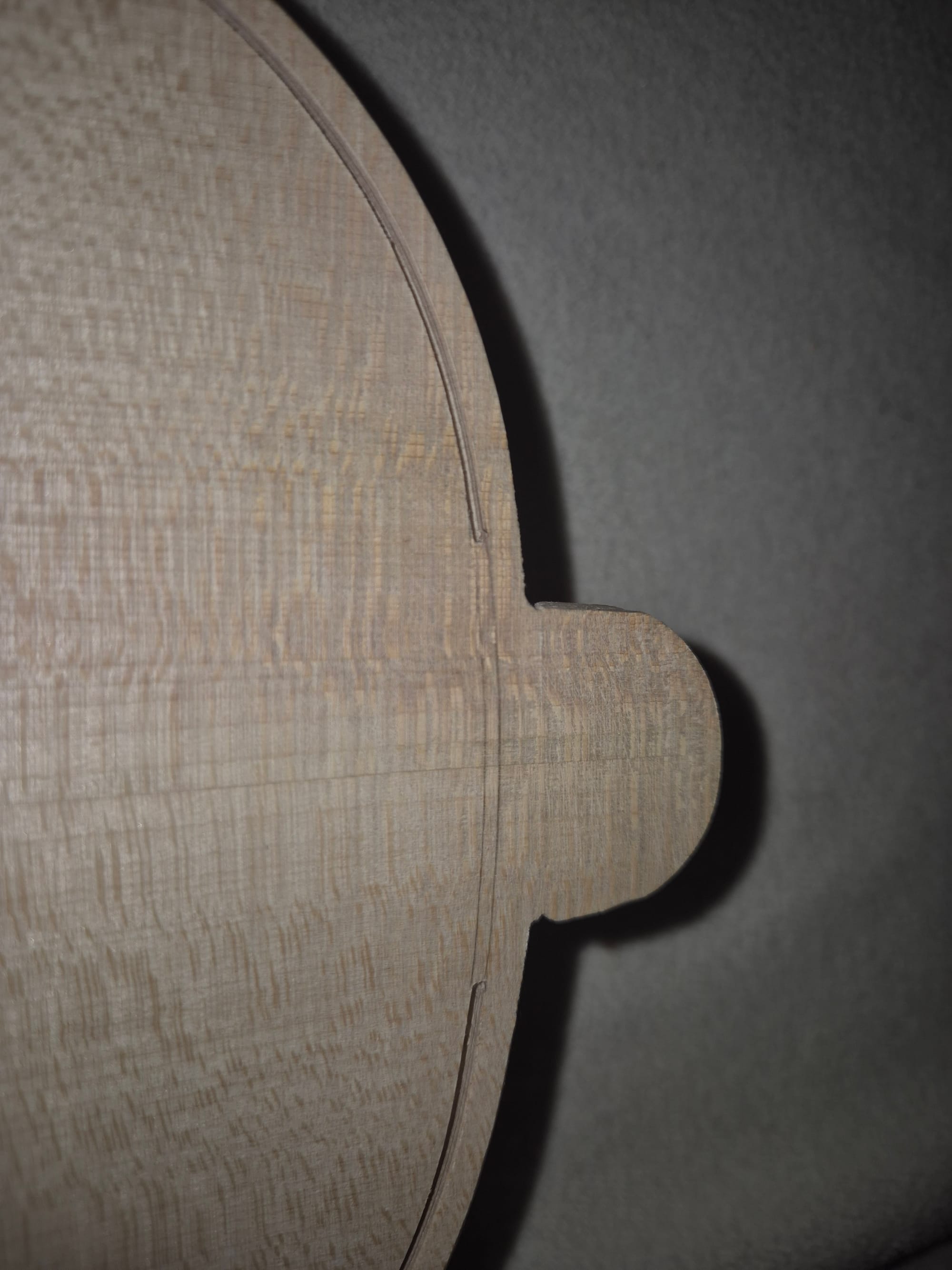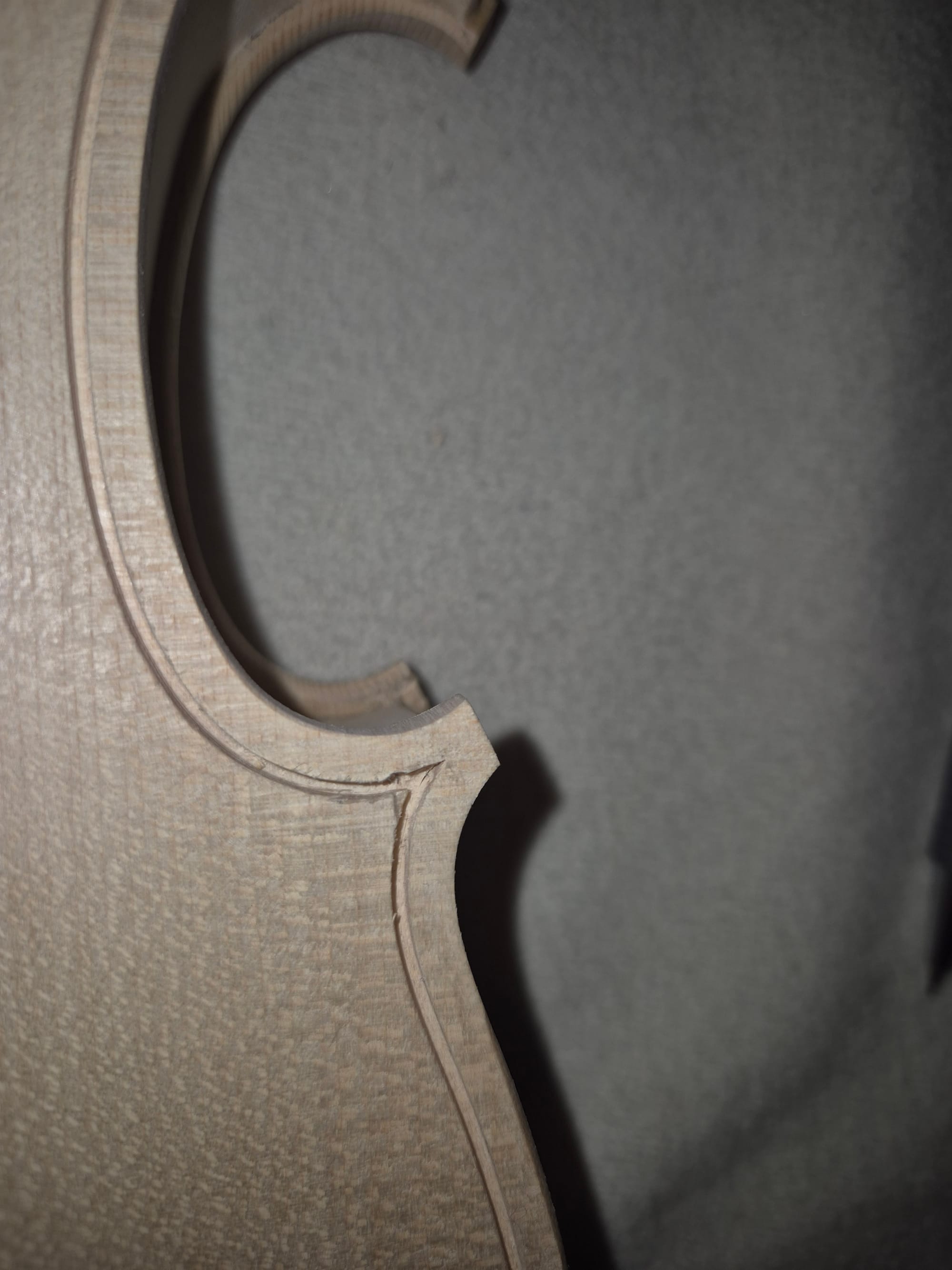 Applying all of those tips, I managed to keep the last inner tip intact. Sadly, the pre-drilled channel goes really close to the edge, and I found it really hard to steer the curve toward the c-bout (on the right on the photo above).