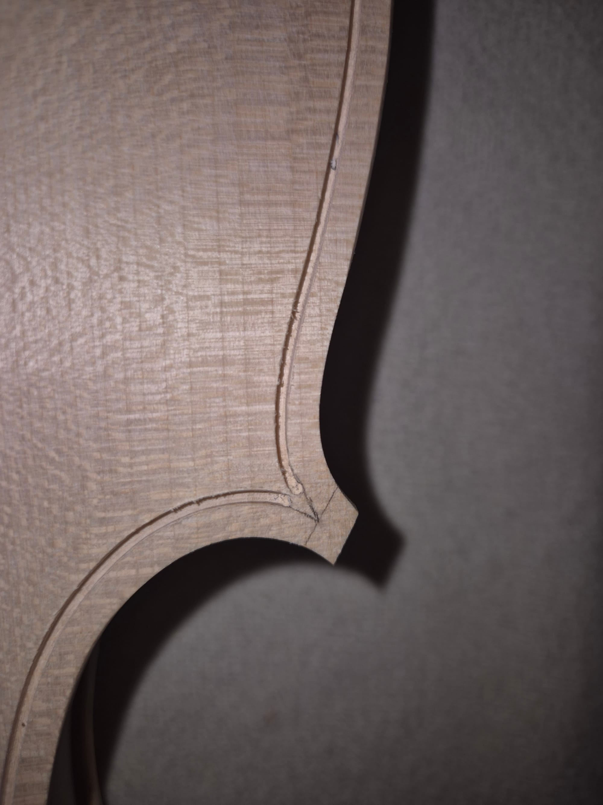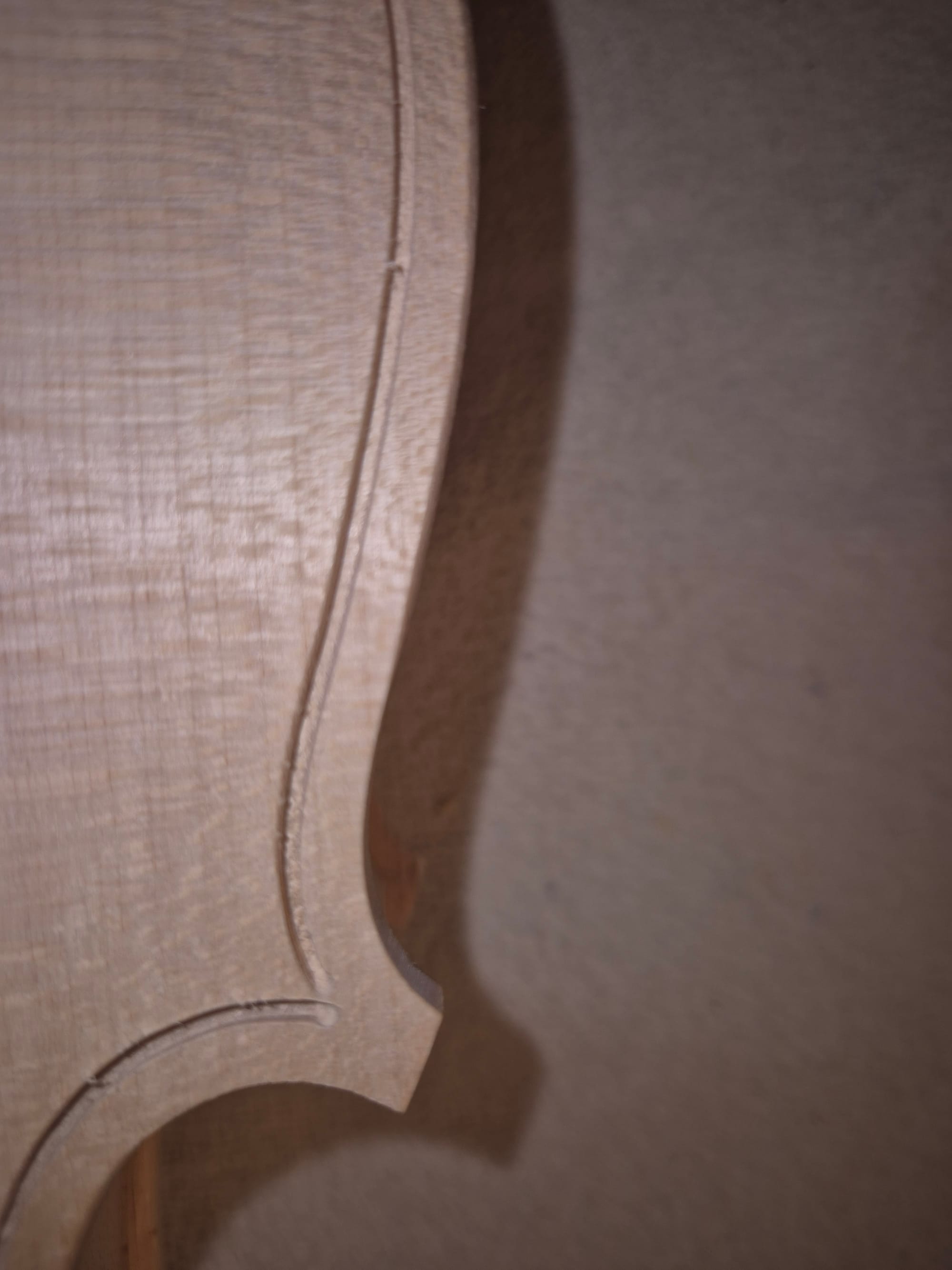 Shaping a corner is no easy feat. The exterior wall of the purfling channel is usually placed around four millimeters from the edge, and the far tip of the corner should use the same distance. The corner curve must flow nicely from both sides, but be slightly curved toward the c-bout. The website Making the violin has an excellent page about this with lots of useful diagrams. It took me lots of drafts on a paper to get an idea of what it should looks like, but once ready I started scribbling on the wood with a pencil.